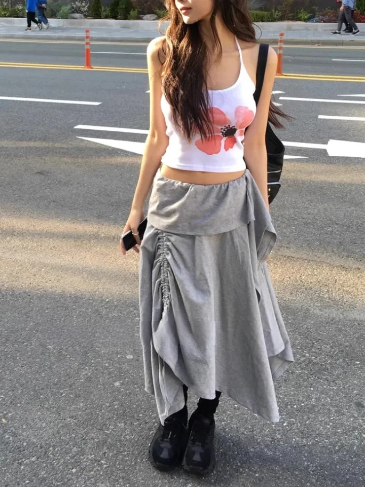 Retro Floral Print ter Top plus Slimming Pleated  Skirt Set Women's Summer Polyester Fiber Versatile Print ter Ne...